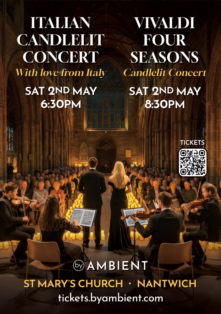 Italian Candlelit Concert starts at St Mary's Nantwich, The Rectory, at 6:30pm, with Vivaldi Four Seasons starting at 8:30pm.