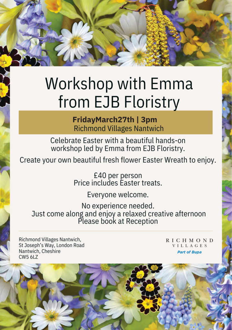 The workshop will be held at Richmond Villages Nantwich on 27 March at 3pm, offering a chance to learn new skills, get creative and enjoy a relaxed, social experience in the run-up to Easter.