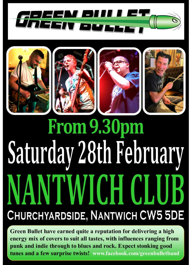 Green Bullet are performing at Nantwich Club, Churchyard Side, on Saturday 28 February.