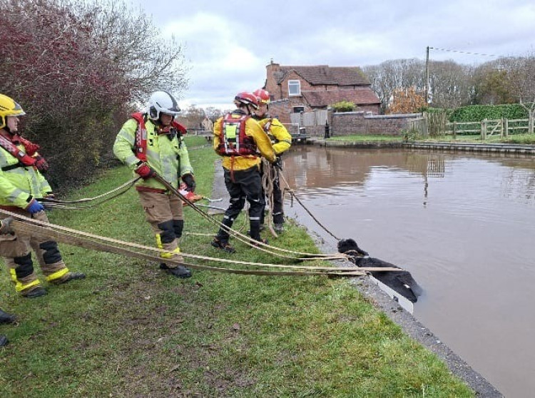 Fire crews helped to rescue a cow that had fallen into a canal near Nantwich, with the animal making a full recovery.