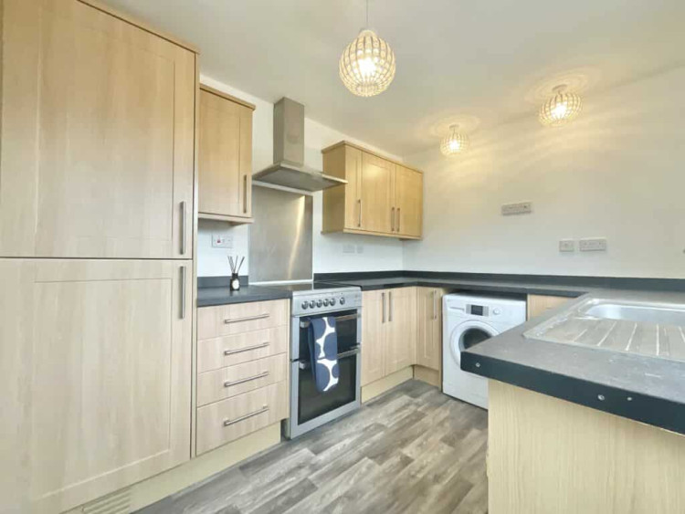 "The kitchen is smartly fitted with a range of oak-effect wall and base units, providing excellent storage and worktop space. There's space for a washing machine, an integrated slimline dishwasher, space for a freestanding cooker, and an integrated fridge freezer—everything you need for modern-day convenience.