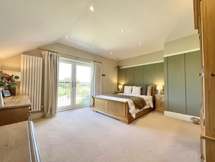 The master suite is a true sanctuary. French doors open to a Juliette balcony where you can soak up uninterrupted views of the surrounding fields.